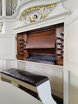In der Kirche steht auch ein kleines Positiv, eine Leihgabe der Manufaktur Alexander Schuke Orgelbau mit fünf Registern (Holzgedackt 8', Rohrflöte 4', Principal 2', Oktave 1', Scharff 3 f.)