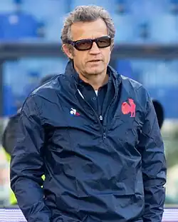 Seit Anfang 2020 trainiert Fabien Galthié die französische Nationalmannschaft, die unter seiner Führung wieder an die Erfolge früherer Zeiten anknüpfen soll. Beim Six Nations 2020 verpasste Frankreich den Turniersieg nur aufgrund der schlechteren Punktedifferenz hinter England. Beim anschließenden Autumn Nations Cup, der die traditionellen End-of-year Internationals ersetzte, erreichte Frankreich das Finale, wo es England unterlag.[91] Auch beim Six Nations 2021 belegte die Mannschaft den zweiten Platz, diesmal hinter Wales. Während den Mid-year Internationals 2021 verloren die Franzosen ihre Auswärtsserie gegen die Wallabies mit 1:2.[92] Im November 2021 gelang der erste Sieg über Neuseeland seit mehr als zwölf Jahren, womit sich die Franzosen die Dave Gallaher Trophy zum zweiten Mal sicherten, und Antoine Dupont wurde von World Rugby als „Spieler des Jahres“ ausgezeichnet.[93] Beim Six Nations 2022 blieben die Franzosen in allen fünf Spielen unbesiegt, womit sie erstmals seit 2010 wieder einen Turniersieg feiern konnten und zugleich zum insgesamt zehnten Mal einen Grand Slam schafften.[94] Während der darauf folgenden Serie in Japan und den End-of-year Internationals 2022 blieben die Franzosen ebenfalls unbesiegt.[95] Beim Six Nations 2023 bekleideten sie abermals den zweiten Platz, diesmal hinter den Iren, gegen welche die einzige Niederlage resultierte. Aufgrund ihrer herausragenden Leistungen waren die Franzosen bei den Laureus Awards 2023 als „Mannschaft des Jahres“ nominiert.[96] Frankreich war Gastgeber der Weltmeisterschaft 2023, in der es nach den Leistungen vor dem Turnier als einer der Turnierfavoriten galt. Im Eröffnungsspiel fügten die Franzosen dem Mitfavoriten Neuseeland die höchste Niederlage bei einem Turnier und die erste Niederlage überhaupt in der Gruppenphase zu (27:13). Im darauf folgenden Gruppenspiel gegen Uruguay tat sich die Reservemannschaft jedoch schwer (27:12). Daraufhin gelangen gegen Namibia der höchste Sieg der Verbandsgeschichte (96:0) und gegen Italien der deutlichste Sieg gegen diesen Gegner überhaupt (60:7). Wermutstropfen war jedoch die Verletzung des Schlüsselspielers und Kapitäns Antoine Dupont im Spiel gegen Namibia, wobei er einen Oberkiefer- und Jochbeinbruch erlitt und sein Einsatz im Viertelfinale gegen Südafrika fraglich erschien. Dieses verlor der Gastgeber gegen den Titelverteidiger und späteren Weltmeister denkbar knapp mit 28:29.[97] Beim Six Nations 2024 erreichten die Franzosen wie im Vorjahr den zweiten Platz hinter Irland. Ein Jahr später gewann das Team seinen insgesamt 27. Titel, verpasste aber den Grand Slam nach einer knappen Niederlage gegen England.[98]