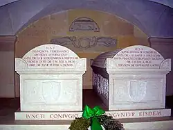 Ein Staatsbegräbnis kam für den Thronfolger nicht in Frage, das stand nur dem Monarchen selbst zu. Ansonsten beschied sich Obersthofmeister Fürst Alfred Montenuovo, der vom Kaiser nicht daran gehindert wurde, mit einem Minimalprogramm. Da für die Herzogin von Hohenberg die Bestattung in der Kapuzinergruft nicht möglich war, hatte Franz Ferdinand schon früher verfügt, zusammen mit ihr in der neu errichteten Familiengruft in Schloss Artstetten beigesetzt zu werden.[44] Die Verabschiedung in der Familiengruft unter der im Schloss Artstetten gelegenen Pfarrkirche fand im engsten Familienkreis statt.[45]