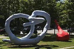 Ab den 1990er Jahren produzierte Franz West farbige Außenskulpturen aus Aluminium und Epoxydharz, welche zu einem charakteristischen Bestandteil seines Werkes werden sollten. Die amorphen Figuren wurden sowohl in Innenstädten, als auch in ländlichen Gegenden aufgestellt und können als Erweiterung von Franz Wests Idee, die betrachtende Person auf einen Dialog einzuladen, gesehen werden. So sollten die Skulpturen ohne Podest oder sonstige Abtrennung meist zugängiglich platziert werden. Zu seinen frühesten Außenskulpturen gehört die Etude de couleur (1991–93), ein bunt gestaltetes Pissoir, welches anlässlich der gleichnamigen Ausstellung auf dem Dach der Villa Arson installiert wurde und den Besuchern die Möglichkeit gab, mit Blick über Nizza auf dem Ausstellungsgelände zu urinieren.[4] Besondere Bekanntheit erlangten Wests Vier Larven aus dem Jahr 2001. Die mehrteilige Aluminiumskulptur inkludiert eine Texttafel mit Heraklit-Zitat („Denen, die in dieselben Flüsse steigen, fliessen immer neue Wasser zu und (immer neue) Seelen entsteigen dem Nass.“), sowie vier über 2,5 Meter große, abstrahierte Köpfe, jeweils mit anderer Mimik. Die Vier Larven wurden an jedem Eckpfeiler der Stubentorbrücke in Wests Heimatstadt Wien installiert, wo sie bis 2021 ausgestellt waren.[5] Eine seiner größten Außenskulpturen ist die bis zu über acht Meter hohe, mehrteilige Skulpturengruppe Les pommes d'Adam, welche unter anderem anlässlich der Foire internationale d’art contemporain (FIAC) 2007 auf dem Place Vendôme in Paris gezeigt wurden.[6]