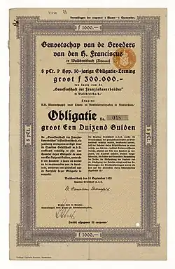 Zum Aufbau ihrer Werke liehen sich die Franziskanerbrüder Geld bei ausländischen Banken. Auf die in Devisen zu bezahlenden Zinsen verlangte das Deutsche Reich besondere Steuern „gegen den Kapitalabfluss“, welche unter den Nationalsozialisten massiv erhöht wurden. Durch systematische Kontrollen wurden alle Fehler bei der Abrechnung, auch kleinste versehentliche Irrtümer, zur Anklage gebracht und mit hohen Geldbußen belegt. Durch diese sogenannten Devisenprozesse versuchte das nationalsozialistische Regime, die Kirche und kirchliche Organisationen finanziell auszubluten. Als die staatlichen Einweisungsstellen daraufhin alle Versorgungsaufträge mit den Behinderteneinrichtungen fristlos kündigten, mussten die Brüder im Dezember 1936 ein Konkursverfahren eröffnen.[5] In diesem Verfahren übernahmen die Nationalsozialisten unter anderem das Behindertenheim St.-Josefs-Heim in Waldniel für rund einen Drittel des wahren Wertes und nutzten es später als „KFA Waldniel-Hostert“ für das Euthanasie-Programm.[6]