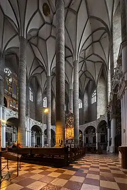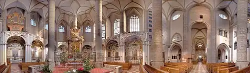 Im Innern findet sich ein hohes schmales dreijochiges Mittelschiff, das umgeben ist von sechsjochigen Seitenschiffen. Dieses Langhaus ist hervorgegangen aus der ursprünglichen spätromanischen Basilika. Im Mittelschiff finden sich rechteckige Kreuzrippengewölbe, in den Seitenschiffen Kreuzgratgewölbe.