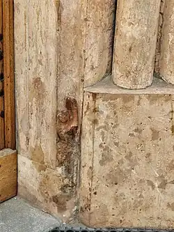 Die Westfassade des 1223 eingeweihten romanischen Langhauses wurde um 1700 barockisiert. Die vorgesetzte Fassade erinnert in ihrer Gliederung der Fensteröffnungen an die Fassade der Basilika Santa Maria degli Angeli bei Assisi, in der sich die Portiuncula-Kapelle befindet. Die Darstellung der Maria Immaculata an der Fassade ist eine Kopie der Immakulata von Bartolomé Esteban Murillo im El Escorial von 1660/65. Maria ist hier nicht wie üblich in rot-blauen, sondern in weiß-blauen Gewändern gekleidet. Sie steht auf einer Mondsichel, die Engel tragen Mariensymbole: Lilien, Rosen, Palmzweig. Teilweise erhalten ist hier an der Außenfassade das romanische Stufenportal aus weißem und rotem Marmor. Dieses Portal wurde um 1700 im Zuge der Barockisierung im damaligen Zeitgeist stark vereinfacht. Das für die Romanik kennzeichnende Tympanon über dem Portal fehlt heute, auch die Füße der Säulen gingen verloren, sodass die Säulen wie eingerammte Pfähle wirken. Die Schwurhand, rechts unten im Portal eingearbeitet, hat zu vielen volkstümlichen Deutungen und Legenden geführt. Sie stellt vielleicht ein mittelalterliches Zeichen für das Kirchenasyl dar[1] oder ist ein Abwehrzeichen gegen alles Böse außerhalb der Kirche.