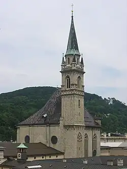 Der heutige Turm der Franziskanerkirche wurde 1496/98 nach Plänen eines Nürnberger Baumeisters ausgeführt und ist so im Stil der Gotik erbaut. 1670 erfolgte die Entfernung des gotischen Turmspitzes. Erzbischof Max Gandolf von Kuenburg hatte es als ungebührlich erachtet, dass der Turm der Franziskanerkirche höher war als die Türme des Domes. Dieser barocke Turmhelm wurde 1866/67 von Josef Wessicken wieder regotisiert.