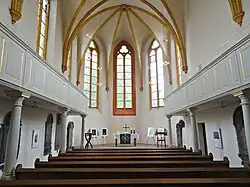 Der frühgotische Ostteil ist seit 1979–1983 schlicht gehalten. Bis auf die Grabsteine sind keine mittelalterlichen oder barocken Inventarstücke mehr erhalten. Zu Beginn der 1980er Jahre ging ein Teil der klassizistischen Innenausstattung verloren. Der (ehemals zweigeschossige) klassizistische Emporeneinbau von 1820 ist dreiseitig umlaufend und ruht auf bauchigen Rundsäulen mit hohen quaderförmigen Basen und viereckigen Kapitellen. Die Empore ist in edlem Weiß gefasst und hat vergoldete Profile. Die Brüstung hat schlichte hochrechteckige Füllungen. Die Westempore dient als Aufstellungsort für die Orgel. Das Kirchengestühl bildet einen Block und ist unterhalb der Emporen zugänglich.