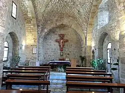 Das jetzige Gotteshaus schließt Strukturen einer Kreuzfahrerkirche aus dem 12. Jahrhundert ein,[41] wobei es sich wahrscheinlich um die mittelalterliche Andreaskirche Akkos handelt.[15][42][43] Die von Bruder Quirico Calella, der 2017 in den Libanon wechselte, angestrebte Ergrabung der mittelalterlichen Krypta bleibt ein Desideratum.[40]