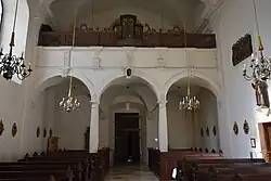 Über Fensteröffnungen verfügt der Kirchenraum nur im Süden, da im Norden die Klostergebäude angebaut sind. Ebenfalls im Süden schließt eine mit Stuckdekorationen versehene Seitenkapelle an das Langhaus an. Sie wurde in der zweiten Hälfte des 17. Jahrhunderts errichtet und trägt über ihrem Zugang das fürstliche Wappen der Esterházy; das Altarbild dieser Kapelle ist eine Nachbildung des Gnadenbildes von Tschenstochau.[6] An der nördlichen Innenwand der Kirche befindet sich im Chor das Oratorium der Familie Esterházy, unmittelbar darunter eine ehemals zur Sakristei führende Tür; im Langhaus sind zwei weitere Oratorien mit hölzernen Rokokogittern, die Rokoko-Kanzel sowie eine zum Kreuzgang führende Tür zu beachten.[4] Die dreiachsige Westempore mit gerader Brüstung ruht auf toskanischen Säulen;[7] die dort mittig aufgestellte Orgel stammt von 1760.[5] Ein weiteres erwähnenswertes Element der Kirche ist das Gestühl auf der Westempore von 1630.[5]