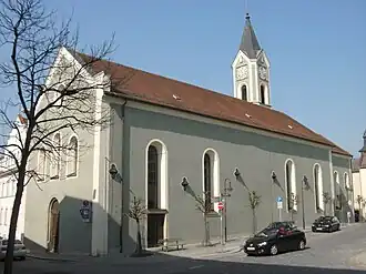 Das dem heiligen Bonaventura, später der Muttergottes gewidmete Kloster wurde 1631 durch Erzdechant Johann Wolfgang Hueber gegründet; es wurde 1802 im Zuge der Säkularisation aufgelöst. Die Kirche war vorübergehend eine Lagerhalle (bis 1866). In die Klostergebäude zog 1856 eine Mädchen-Oberschule der Armen Schulschwestern.
