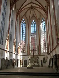 Um 1350/60 entstanden die wertvollen Glasfenster und Ende des 15. Jahrhunderts die Fresken im Langhaus und im Chor. In der Mitte des Chores befindet sich die Grabplatte des Predigers Berthold von Regensburg, der von 1226 bis zu seinem Tod 1272 dem Regensburger Minoritenkonvent angehörte.