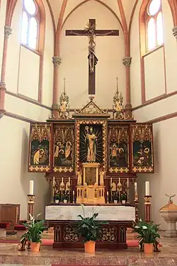 - Hochaltar nach den Plänen von Pater Johannes Maria Reiter, gefertigt von dem Kunsttischler Clemens Raffeiner aus Schwaz (Tirol).