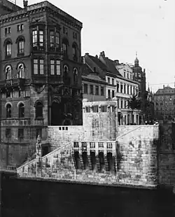 Auf der Rückseite dieser Architektur führte eine markant ausgebildete Treppe an der Ufermauer hinab zum Fluss, der so sehr im Zentrum des Lebenswerkes von Franzius gestanden hatte.[2]