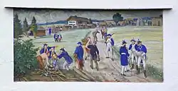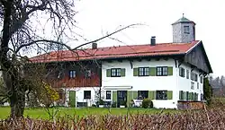 An der Stirnseite erinnern ein Text und ein Gemälde an das Franzosenlager.[2][3] Es ist nach einer Vorlage des Zeichenlehrers Ludwig Weiß gemalt und 1958 von Kunstmaler Robert Schraudolph aus Sonthofen worden.[4] Beides wurde 2018 von Malermeister Hans-Peter Hartmann aus Kempten-Leubas aufgefrischt.