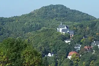 ![]() Blick zum Hainstein (Bildmitte), im Hintergrund der Standort der Burg Metilstein | ||