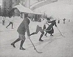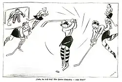 Im Jahr 1923 berichtete Die Woche: „Eishockey-Spielerinnen treten zum 100-Meter-Wettlauf mit einem Fußball an, den sie mit Hife ihres langen Eishockey-Schlägers zum Ziel treiben.“[4] Das Titelblatt der Fliegenden Blätter Nr. 4407 von 1930 widmet sich dem Fraueneishockey.[5]