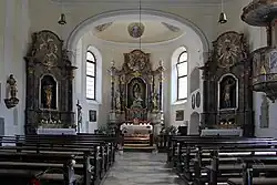 Den Hochaltar (um 1755) ziert eine spätgotische Marienfigur. Die Figuren der Seitenaltäre entstanden um 1877. Die Kanzel stammt aus der Erbauungszeit der Kirche. Das Deckengemälde stellt die Himmelfahrt Mariens dar.[1]