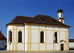 Die Saalkirche mit Walmdach wurde nach Plänen des fürstbischöflichen Hofbaudirektors Maurizio Pedetti auf der Grundlage eines Vorgängerbaus von Jakob Engel aus dem Jahr 1678 neu erbaut. Der zweigeschossige Dachreiter an der Nordseite auf einem schmalen Risalit wird von einer Zwiebelhaube mit Dachknauf und Kreuz gedeckt. Die Sakristei stammt noch vom Vorgängerbau. Die Fassade wird durch Bänder und Lisenen gegliedert. Der Chor besitzt einen Halbrundschluss.