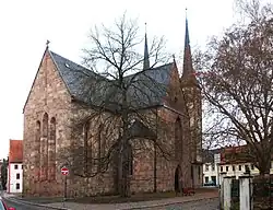 - Das Gelände um die Frauenkirche war der Friedhof für die Oberstadt, bis 1542 vor dem Pappischen Tor ein neuer Friedhof angelegt wurde. Die innerstädtische Friedhofsmauer wurde 1799 abgetragen.[12]
