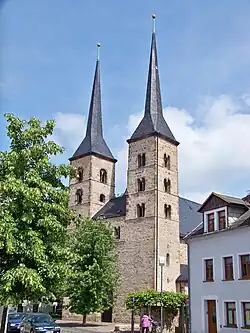Der älteste Teil der Kirche ist die Ende des 12. Jahrhunderts entstandene Westturmfront im romanischen Baustil. Das breite Turmwerk bildet eine mit gekuppelten Rundbogenfenstern versehene Halle. Darüber teilt es sich in zwei einzelne Türme mit je drei Stockwerken, ebenfalls mit gekuppelten Rundbogenfenstern mit unterschiedlich gemeißelten Kapitellen. Die Höhe beider Türme beträgt rund 46 Meter.[1]