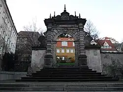 Es ist jedoch nicht das Original, welches 1614 im Auftrag der Tuchmacherzunft errichtet wurde und ursprüngliche auch an einem anderen Platz stand. Es sollte auch einen Eingang für den Meißner Stadtfriedhof direkt hinter der Frauenkirche darstellen. Die Nachbildung ist ein Werk des Dresdner Bildhauer Christian Hempel von 1954–56. Der Friedhof wurde verlegt, womit seine Funktion verloren ging. Es ist ein wichtiges Denkmal der Renaissance in der Stadt Meißen.[8] Das Original wurde 1956 ins Stadtmuseum gebracht und eine Kopie neben der Kirche aufgestellt.
