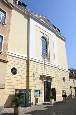 Die ursprünglich barocke Saalkirche mit einem Schopfwalmdach wurde 1825/26 in klassizistischen Formen unter Johann Nepomuk Amann umgebaut. Die vorgestellte, im Kern barocke niedrige Doppelturmfassade ist in die geschlossene Verbauung der Frauengasse eingebunden. Die klassizistische zweizonige Westfassade mit Putzquaderung, vermutlich von Joseph Kornhäusel (renoviert 1924 und 1934). Zwischen traufgleichen Türmen, je mit gaupenbesetzten Mansarddächern über umlaufendem Traufgesims, befindet sich ein seichter, flach übergiebelter Mittelrisalit. Dem Rechteckportal mit gerader Verdachung über Volutenkonsolen ist ein hohes Rundbogenfenster in rechteckiger Putzrahmung und eingestellter Balustrade übergelagert.[7]