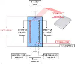 Die Trennkammer besteht je aus einer Rückplatte und einer Frontplatte. Die Rückplatte besteht aus einem kühlbaren Aluminiumblock, der mit einer kunststoffbeschichteten und verspiegelten Glasplatte beschichtet ist. Die Frontplatte besteht üblicherweise aus Acrylglas (PMMA). Der Abstand der Platten beträgt bei kommerziellen Systemen üblicherweise 0,1 – 0,5 mm. In der Frontplatte befinden sich die Einlässe für die Trennmedien, die Probeneinlässe, die Fraktionierschläuche und die Elektroden. Die Trennmedien und Proben werden je über eine Schlauchpumpe in die Trennkammer gefördert. Wichtig hierbei ist, dass eine laminare Strömung vorliegt. Senkrecht zur Flussrichtung wird das elektrische Feld über die Elektroden aufgebaut. Am Ende der Trennkammer wird die getrennte Probe in 96 Fraktionierschläuchen abgegriffen und in die Auffanggefäße geleitet.[6]