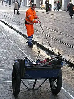 Die Sauberhaltung der Wasserläufe obliegt mindestens seit 1789[40] den vier „Bächleputzern“ (früher: „Bachräumern“).[41] Verantwortlich dafür war bis 2010 der Energieversorger Badenova beziehungsweise deren Vorgänger die Freiburger Energie- und Wasserversorgung. Seit 2011 fällt die Aufgabe in die Zuständigkeit der Abfallwirtschaft und Stadtreinigung Freiburg GmbH.[42] Die Bächleputzer befreien zweimal pro Tag die Bächle von Laub und Abfällen,[43] die sich zudem auch in Rechen an den Abflüssen sammeln.[38] Zudem wird jährlich im Herbst sowie an einem Wochenende im Frühjahr der sogenannte Bachabschlag durchgeführt, bei dem das Wasser aller Kanäle und Bächle für zwei Wochen abgelassen wird.[44] Der Bachabschlag wird zum einen zur Reinigung genutzt, zum anderen um die Bächle auf eventuelle Schäden zu prüfen und gegebenenfalls zu reparieren. Weitere Gründe für eine Abschaltung sind z. B. Baustellen sowie das Freiburger Weinfest und der Fasnetumzug, an dem dann auch die Narrenhästräger der 1935 gegründeten Narrenzunft Bächleputzer zu bewundern sind. Am Aschermittwoch folgt dann unter Heulen und Klagen die Tradition der Geldbeutelwäsche vor dem Rathaus.[45] Auch während Dürreperioden wie 2003 und 2018 liegen die Bächle trocken, weil die Dreisam zu wenig Wasser führt. Bisweilen wurden dann die Bächle nur tagsüber mit Wasser versorgt und des Nachts blieb es in der Dreisam.[46] Ebenso werden bei längeren Frostperioden die Bächle abgestellt.[47][48]
