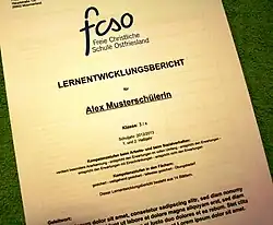 Die Leistungen der Schülerinnen und Schüler werden in den Jahrgängen 1 bis 4 ohne Schulnoten bewertet. Im Januar finden ausführliche Lernentwicklungsgespräche mit den Kindern und ihren Eltern statt. Am Ende eines Schuljahres erhalten die Schülerinnen und Schüler einen Lernentwicklungsbericht ohne Zensuren. Darin werden der individuelle Lern- und Leistungsstand des jeweiligen Kindes beschrieben und seine Kompetenzen, Fertigkeiten und Interessen besonders betont.[51] Darin unterscheidet sich die Primarstufe FCSO von den meisten anderen Grundschulen.