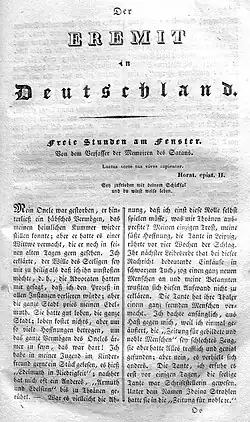 - Wilhelm Hauff: Freie Stunden am Fenster. In: Der Eremit in Deutschland : eine Schrift über Sitten und Gebräuche des 19. Jahrhunderts in Monatsheften, Band 1, 1826, S. 287–306.