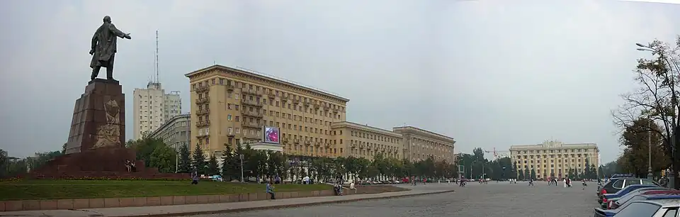 Am Übergang von dem runden zum rechtwinkligen Teil des Platzes stand das – am 5. November 1963 eingeweihte und insgesamt 20,2 m hohe – Lenindenkmal mit einer 8,5 m hohen Bronzeskulptur auf einem Sockel aus rotem Granit. Es galt als das höchste Lenindenkmal der Ukraine. Am Abend des 28. September 2014 wurde die Leninstatue auf dem Freiheitsplatz gestürzt.[5] Der Sockel wurde im August 2016 abgetragen.[6]