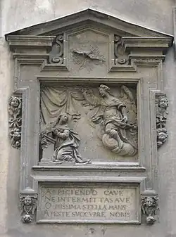 Das barocke Bürgerhaus mit mehrfach geknickter Fassade liegt an der Ecke Freisingergasse / Bauernmarkt. Es war das Wohnhaus des Hofbankiers von Kaiser Leopold I., Samuel Oppenheimer. Im 19. Jahrhundert war es ein Stiftungshaus des Wiener Bürgerspitalfonds. In der Freisingergasse ist über dem ursprünglichen Portal ein Hausrelief mit der Darstellung von Mariä Verkündigung zu sehen, in einer Rahmung mit Dreiecksgiebelverdachung mit Hl. Geist-Taube, Cherubsköpfen und Fruchtgehänge. Eine lateinische Inschrift ruft Maria um Schutz vor der Pest an.
