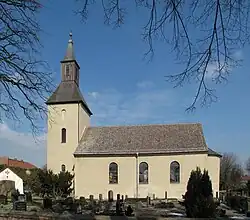 Die vom Friedhof umgebene schlichte Dorfkirche wurde 1755 gegenüber dem Dorfanger auf den Grundmauern einer ehemaligen Feldsteinkirche errichtet. Am 18. April 1854 wurde die um eine Apsis erweiterte Kirche eingeweiht.[12] Bei der Erneuerung der abgebrochenen Kirchturmspitze 1910 wurden in der kupfernen Kugel alte Münzen aus der Zeit Friedrichs des Großen und vergilbtes unleserliches Papier gefunden. Zwischen 1993 und 1995 erfolgte die Erneuerung des Dachs und Restauration der Wandmalereien.[11][13] Die Orgel aus dem Jahr 1890 stammt von dem Potsdamer Orgelbaumeister Carl Eduard Gesell und wurde mit neun Registern, einem Manual und Pedal ausgestattet.[14] Im Jahr 2000 wurde das Instrument saniert. Das Geläut besteht aus einer undatierten Bronzeglocke und einer Stahlglocke aus dem Jahre 1952 der Glockengießerei in Apolda.