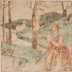 | 24 | Südwand unten, rechts aussen | Ein Pilger betet vor dem Wolfgangsbild, das an einem Baum hängt | Ein Hinweis auf die Gründungsgeschichte der Kirche (eine von vier) |