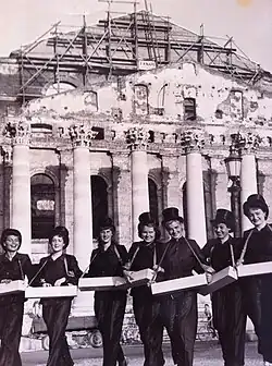 Tatsächlich schrieb im Sommer 1954 das Bayerische Finanzministerium den Wettbewerb zum Aufbau des Nationaltheaters nach den Vorstellungen der „Freunde“ aus: Die Außenansicht des alten Gebäudes sollte wiederhergestellt, im Inneren ein „neuzeitlicher, theatertechnisch einwandfreier und wirtschaftlicher Bühnenbetrieb“[14] ermöglicht werden. 1957 erteilte der Bayerische Staat schließlich den Auftrag zum Wiederaufbau des Nationaltheaters. Als das Nationaltheater am 21. November 1963 mit einer Aufführung der Oper Die Frau ohne Schatten[14] von Richard Strauss wiedereröffnet wurde, lagen die Baukosten bei 67,7 Millionen D-Mark. Abgesehen von ihrem ideellen Einsatz steuerten die „Freunde des Nationaltheaters“ einen Spendenbeitrag von 6,5 Millionen D-Mark bei.[15] Der große Lüster im Zuschauerraum, die Deckenbemalung im Königssaal, viele Teile des Dekors und fast die komplette Bestuhlung – jeder Stuhl wurde mit einer Plakette und dem Namen des Stifters versehen – konnten durch Spenden der „Freunde“ finanziert werden. Für die „Freunde des Nationaltheaters“ bildete der 29. November 1963 den feierlichen Höhepunkt ihrer Bemühungen. An diesem Tag waren alle Stifter der Zuschauersessel als Ehrengäste zur Aufführung der Meistersinger von Nürnberg eingeladen. Alle Mitglieder des Vereins, alle bedeutenden Spender und ebenfalls alle Mitglieder der Staatsoper erhielten als Erinnerung an diesen Tag eine Plakette aus Nymphenburger Porzellan mit einem Abbild des Nationaltheaters.