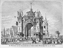 Der Verein zur Feier des 19. October organisierte zum 50. Jahrestag des Sieges in der Völkerschlacht verschiedene Gedenkveranstaltungen. Unter anderem wurde am Abzweig der Naunhofer von der heutigen Prager Straße der Grundstein für ein künftiges Völkerschlachtdenkmal gelegt. Von hier begab sich der Festzug zum ehemaligen Äußeren Grimmaischen Tor, wo zur Einweihung des Fricciusdenkmals ein Ehrentor errichtet worden war. Das Denkmal stand an der Einmündung der Salomonstraße in die Dresdner Straße.