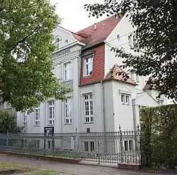 Zur Straße hin ist das Gelände durch einen schmiedeeisernen Zaun begrenzt.[2]