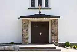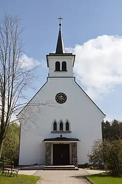 Über dem Westgiebel der Kirche ist ein dachreiterartiger quadratischer Turmaufsatz aus Ziegelmauerwerk mit rundbogigen Schallöffnungen angebracht. Er trägt einen achtseitigen, verschieferten Spitzhelm mit einem vergoldeten Kreuz. Am Ende des Zweiten Weltkriegs wurde der Turm im April 1945 durch Artilleriebeschuss beschädigt, aber danach wieder instand gesetzt.