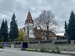 Die Friedenskirche befindet sich an der Bahnhofstraße 36. Sie wurde 1910/1911 durch den Evangelischen Kirchenbauverein nach einem Entwurf des Architekten Clemens Kattner errichtet. Der Betsaal besitzt ein Schopfwalmdach. An der Südseite befinden sich Rundbogenfenster zwischen Strebepfeilern, an der Ostseite Ovalfenster über Rundbogenfenstern. Der Eckturm im Nordosten weist ein Pyramidendach auf. Westlich des Kirchengebäudes schließt das eingeschoßige Pfarrhaus an.