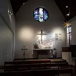 Der Innenraum ist weiß verputzt und vor allem durch das hohe, offene, in dunklem Braun kontrastierende Dach geprägt. Diese hölzerne Satteldecke ruht seitlich auf einem Rahmenbalken, während die Verstrebungen frei durch den Raum greifen. Im Westen befindet sich eine eingezogene Empore, über der die Orgel angebracht ist. Der Altarbereich ist durch einen zweistufigen Aufgang leicht erhöht. Ein Chor im strengen Sinne existiert nicht, aber durch die eingeschossige Raumflanke des Eingangsbereichs, die nur bis zum Altarbereich geführt wird, und das schmale farbige Seitenfenster entsteht allerdings ein abgesetzter Bereich mit Chorcharakter. Optisch betont wird der Altarbereich zudem durch ein großes farbiges Rundfenster oberhalb des Altars.[12] Ein wiederkehrendes ikonografisches Symbol des Altarbereichs ist das Dreieck. Es ist durch den dreieckigen Giebel, die dreieckige Gesamtheit aus Kreuz und Altarplatte, sowie eine Dreiecksgravur im Altarsockel dreifach vorhanden und symbolisiert die Dreifaltigkeit.[13]