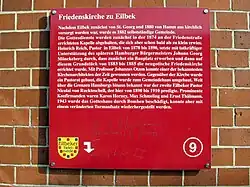 Die Friedenskirche ist die 9. Station der Eilbeker Tafelrunde. Auf einer roten Tafel werden historische Hintergründe erklärt.