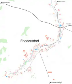 In der Literatur wird Friedersdorf oft als Friedersdorf bei der Landeskrone oder auch Friedersdorf an der Landeskrone bezeichnet, was auf seine Lage, „eine Stunde westlich von der Landeskrone“ zurückzuführen ist.[4][5]