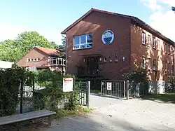 Inmitten des Stadtbezirks wurde am 11. November 1968 die Friedheim-Schule zunächst als Volksschule eröffnet. Seit Jahrzehnten wird sie aber nur noch von Grundschülern des Stadtbezirks besucht.[18][19] Die Bebauung wuchs weiter, bis sie letztendlich in den 1970er-Jahren mit dem Neubaugebiet Am Fördewald bis an den Glücksburger Wald heranwuchs.[20] An der Straße Rabenslücke, sowie östlich von dieser, entstanden Flachdachsiedlungsbereiche, darunter die bemerkenswerten Einfamilienhäuser Wacholderbogen 16 und 45, 47 aus den Jahren 1971/72. Der Architekt der beiden letzteren Flachdachhäuser, Edgar Asmussen aus Weding, zeigte sich beeinflusst durch einen Amerika-Besuch und dem landschaftsbezogenen Gestaltungsansatz von Frank Lloyd Wright. Das Flachdachhaus Wacholderbogen 16 wurde 1972 mit dem Preis des Innenministers des Landes Schleswig-Holsteins für landschaftsbezogenes Bauen ausgezeichnet.[21]