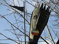 Ebenfalls in diesem Zeitraum wurden die beiden weißen Hochhäuser auf der Osterkoppel und dem Berg beim Eichenkratt hochgezogen, die seitdem weithin sichtbare Akzente setzen.[22] Der Berg beim Eichenkratt stellt mit einer Höhe von ungefähr 55 m ü. NN die größte Erhebung des Stadtteils Mürwik dar.[23] Als einer der „ersten Bewohner der Osterkoppel“ gilt der Klabautermann, der dort als Skulptur des Flensburger Bildhauers Hermann Sörensen am 8. Juli 1976 aufgestellt wurde.[24] Auch kulturell lebte der Stadtbezirk auf. Seit 1979 findet in Solitüde am Rande des Stadtbezirks das Solitüdefest statt. Zeitgleich wurde Ende der 1970er-Jahre im Stadtbezirk Friedheim die Angeliter Trachtengruppe von 1979 e. V., die überregional Bekanntheit erlange, gegründet.[25] 1980 wurde ein kleines Doppelhaus am Ende der Straße Friedheim abgerissen. Das besagte Haus, Friedheim 109, besaß Ähnlichkeit mit den heute noch existierenden Haus Friedheim 107. 1980/81 wurde an dessen Stelle ein kleines Ärztehaus errichtet, in dem sich neben zwei oder drei Ärzten eine kleine Apotheke ansiedelte.[26] Bald darauf, im Jahr 1984, wurde der ehemalige Bauernhof der Familie Samuelsen abgerissen, so dass heute nur noch die Straße Am Bauernhof, die ihren Namen 1957 erhalten hat, an diesen erinnert.[27][28]