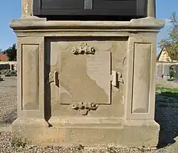 Zentral dominiert eine Inschriftentafel im Giebel das Portal. Die Inschrift beschreibt die Anlage und Erweiterung des Friedhofs und schließt mit einem Bibelvers ab. Sie lautet: „Als man schrieb MVLXXXXVIII/ wardt dieser Gottsacker gemacht./ Welcher als man zuvor 1542 zehlt den Verstorbenen zur Ruhestatt erwehlt. HERR LEHRE UNS BEDENCKEN DAS WIR STERB/ EN MÜSSEN AUF DAS WIR KLUG WERDEN/ Psalm 90“.[3] Die Tafel wird auf jeder Seite von angedeuteten Schlössern eingerahmt.