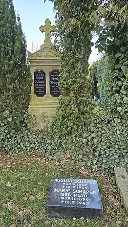 Auf der Friedhofsfläche findet sich unter anderem ein Kriegsgrab für ein Opfer des Ersten Weltkrieges sowie für 47 während des Zweiten Weltkrieges bei einem Luftangriff am 23. September 1943 ums Leben gekommenen Zivilpersonen. Unter diesen Frauen und Männern finden sich sowohl Deutsche,[3] aber auch 18 aus Osteuropa stammende und in den umliegenden Rüstungsbetrieben eingesetzte Zwangsarbeiter, die bei Alliierten Bombenangriffen im September 1944 ums Leben kamen. Diese Zwangsarbeiter kamen aus der Sowjetunion, Polen, Belgien, den Niederlanden und aus der Tschechoslowakei.[4]