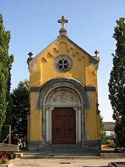 - Das neuromanische Mausoleum Sigismund von Österreich (1826–1891) ist aus 1893. Das Trichterportal hat ein Tympanon mit dem Relief Maria mit Kind.