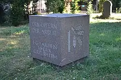 Opfer der Arbeit ist eine von der IG Farben, Werk Griesheim in Auftrag gegebene Sammelbegräbnisstätte für die seit 1917 im Werk verunglückten Arbeiter. Das Denkmal in Form eines Würfels wurde nach Entwürfen einer Bildhauerklasse von Prof. Richard Lisker erstellt. Rund um den Würfel sind liegende Steinplatten mit den Namen der Verstorbenen angebracht.