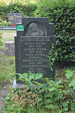 | B/17 | Plewa | 1935 | Stele aus poliertem Diabas. Im Bogenfeld der Treppengiebels befindet sich das Büstenrelief einer Trauernden. | ||