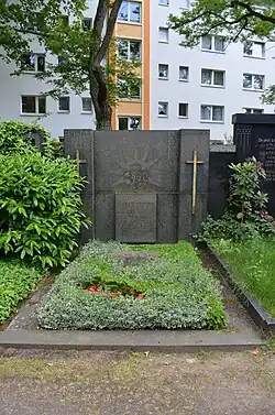 | B/19-20 | Grünewald | 1934 | Johann Tempel | Zwei durch einen gemeinsamen Sturz verbundene Schriftstelen aus poliertem Diabas. Im Zwischenraum befindet sich ein Kreuz aus schlanken Bronzeprofilen | |
