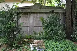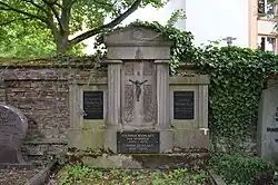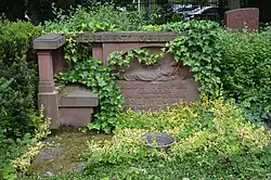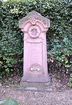 | D/Nordmauer, Grenze zu B | Peter Hafner | 1888 | Grabmal von Peter Hafner (1818–1888), Bürgermeister. Der Grabstein ist eine Schriftstele aus rotem Sandstein in Formen der Renaissance. Die giebelartige Verdachung ist mit floralen Reliefs geschmückt. Darunter befindet sich ein reliefierter Kranz. | ||