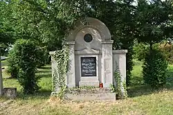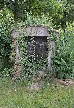 | C/224-225 | Günther | 1914 | Neoklassizistische Ädikula mit einem Schweifgiebel gebrochenen Umrisses tragenden kannelierten Pilastern aus Kalk-Kunststein. Das Schriftfeld besteht aus schwarzem Granit. | ||